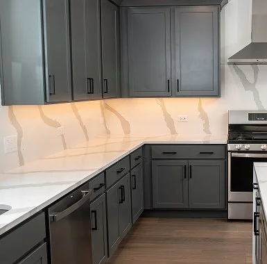 Quartz is engineered for consistency and durability. It provides a controlled appearance with strong resistance to staining and wear, making it suitable for high-use areas.